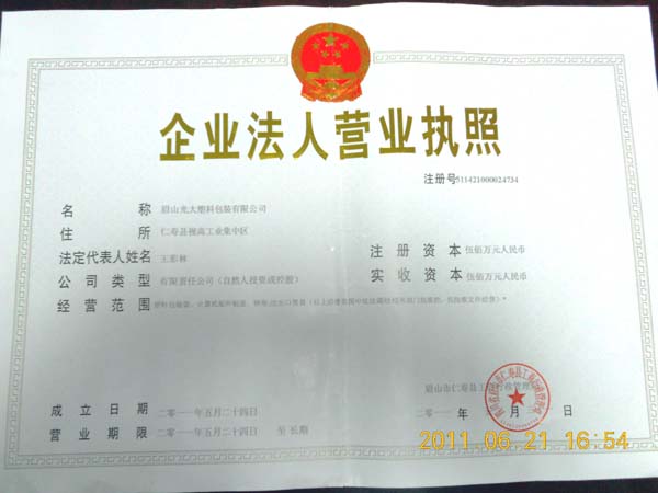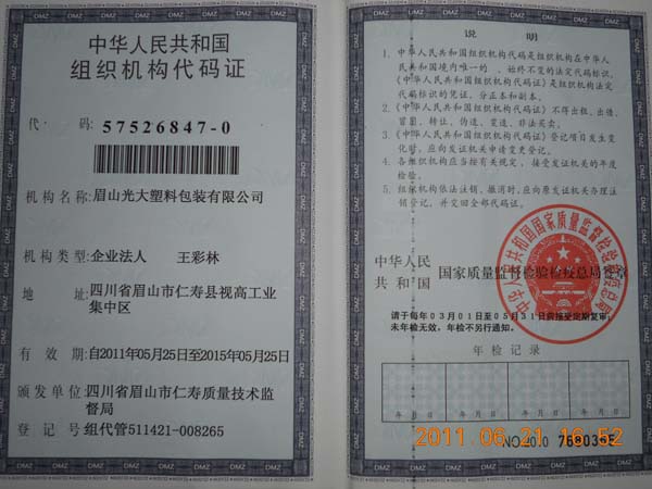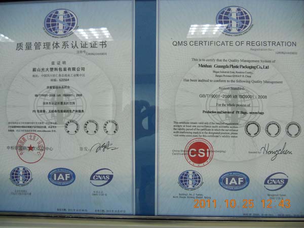 眉山光大塑料包裝有限公司通過了ISO9001和SO14001質(zhì)量體系認(rèn)證